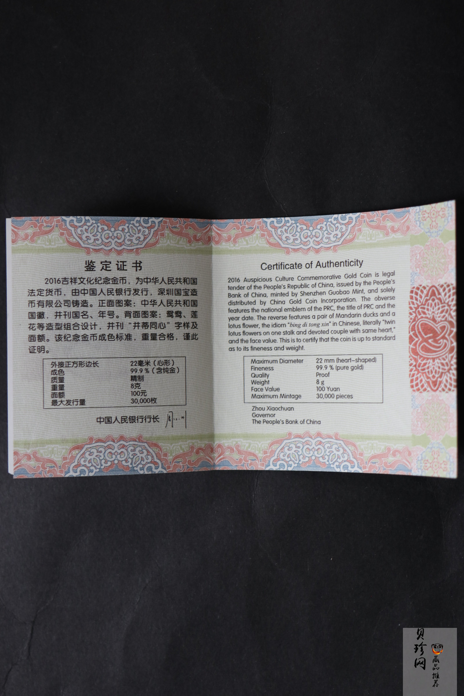 单币:2016年吉祥文化-并蒂同心8克心形精制金币