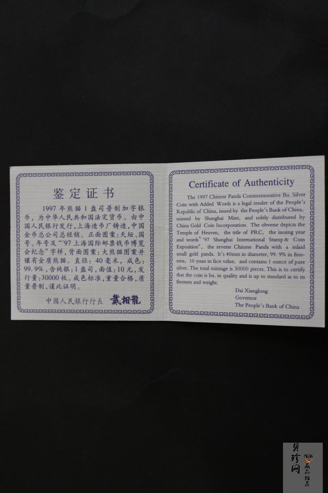中国人民银行发行“1997上海国际邮票钱币博览会”纪念银币,依旧为“熊猫”加字,母本为1997版“熊猫”1盎司普制银币,制作延续“1996北京国际钱币博览会”设计与加工,继续采用了镶嵌工艺。其式样,同样为“银镶金加字熊猫币”。