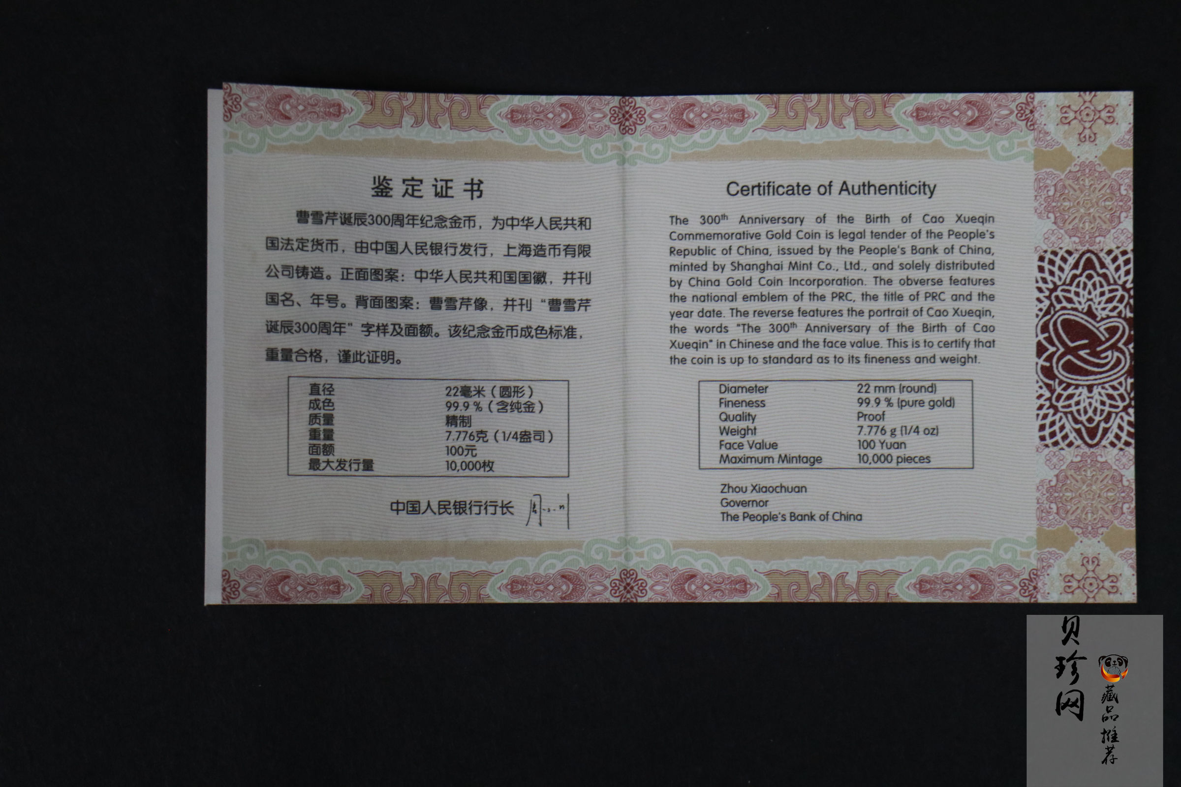 • 【151201】2015年曹雪芹诞辰300周年1/4盎司精制金币