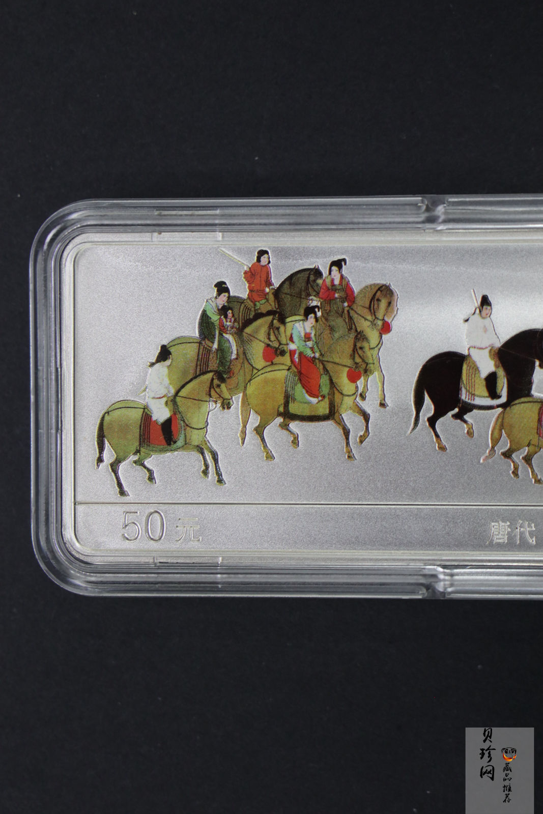 “虢国夫人游春图”彩色银币时规格为90*40毫米长方形5盎司彩色银币,正面为唐代长安大明宫含元殿的正面全景,背面图案即使《虢国夫人游春图》。