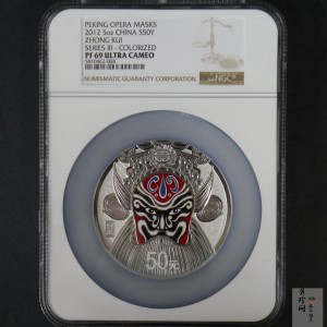 中国现代金银币“京剧脸谱”系列选题,2012年为收官之作。该系列起于2010年,前后共3组,前两组为1金2银格局,第3组以超常规2金3银阵容华丽落幕。其中新增5盎司银币,则沿用第1组1盎司银币题材“钟馗”。虽题材重复,但设计与雕刻均为新作,类似炒旧现象,前期中国现代金银币也有,但相同题材有不同设计与雕刻,相对少见。