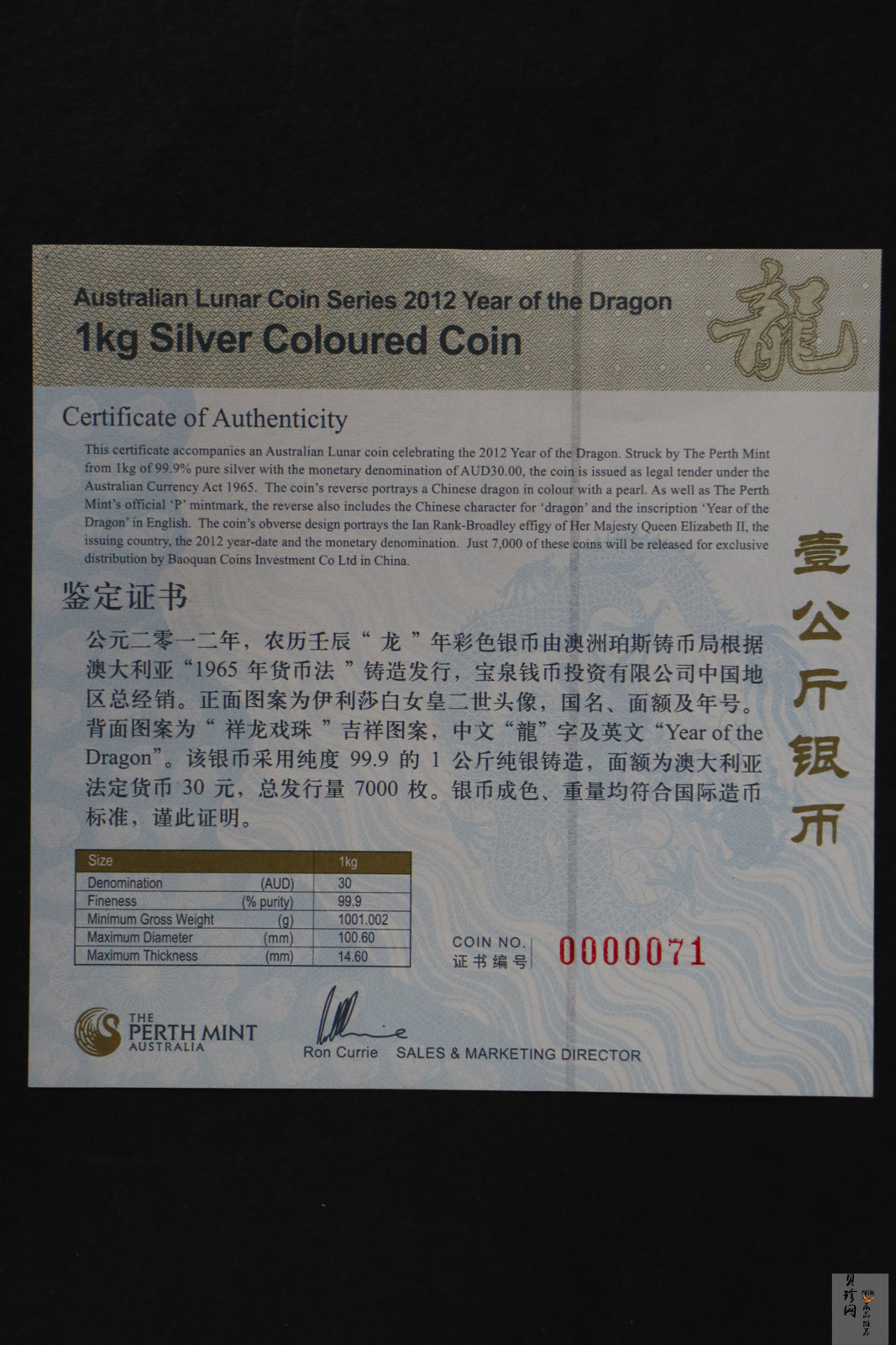 • 【129520】2012年祥龙戏珠公斤纪念银章