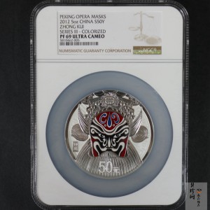 中国现代金银币“京剧脸谱”系列选题,2012年为收官之作。该系列起于2010年,前后共3组,前两组为1金2银格局,第3组以超常规2金3银阵容华丽落幕。其中新增5盎司银币,则沿用第1组1盎司银币题材“钟馗”。虽题材重复,但设计与雕刻均为新作,类似炒旧现象,前期中国现代金银币也有,但相同题材有不同设计与雕刻,相对少见。