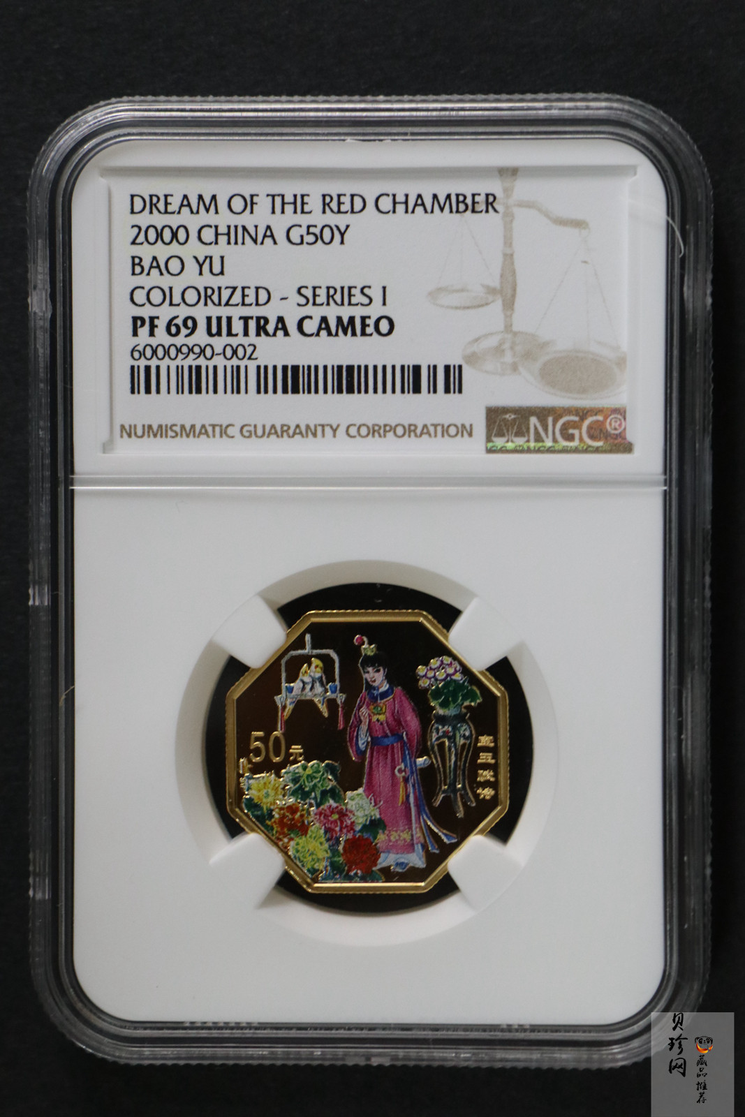 单币:2000年中国古典文学名著——《红楼梦》彩色金银纪念币(第1组)-宝玉赋诗1/2盎司八边形彩色精制金币