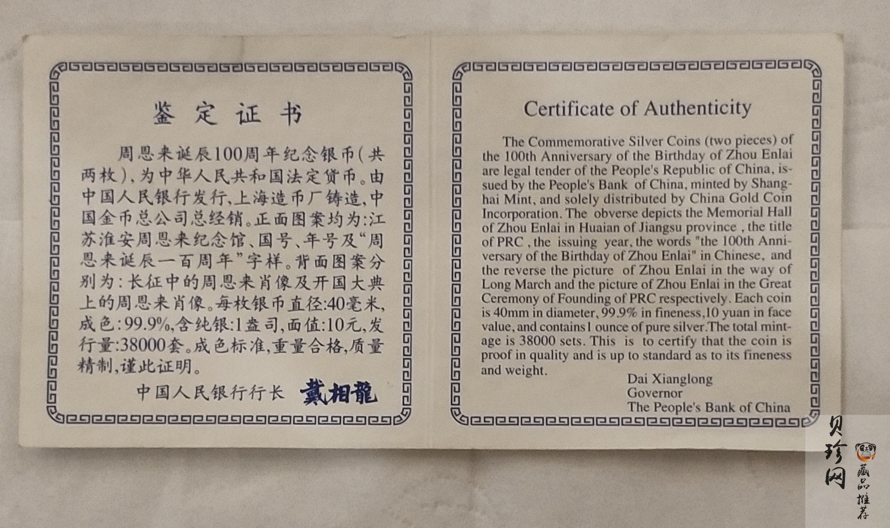 单币:1998年周恩来诞辰100周年1盎司精制银币两枚一套