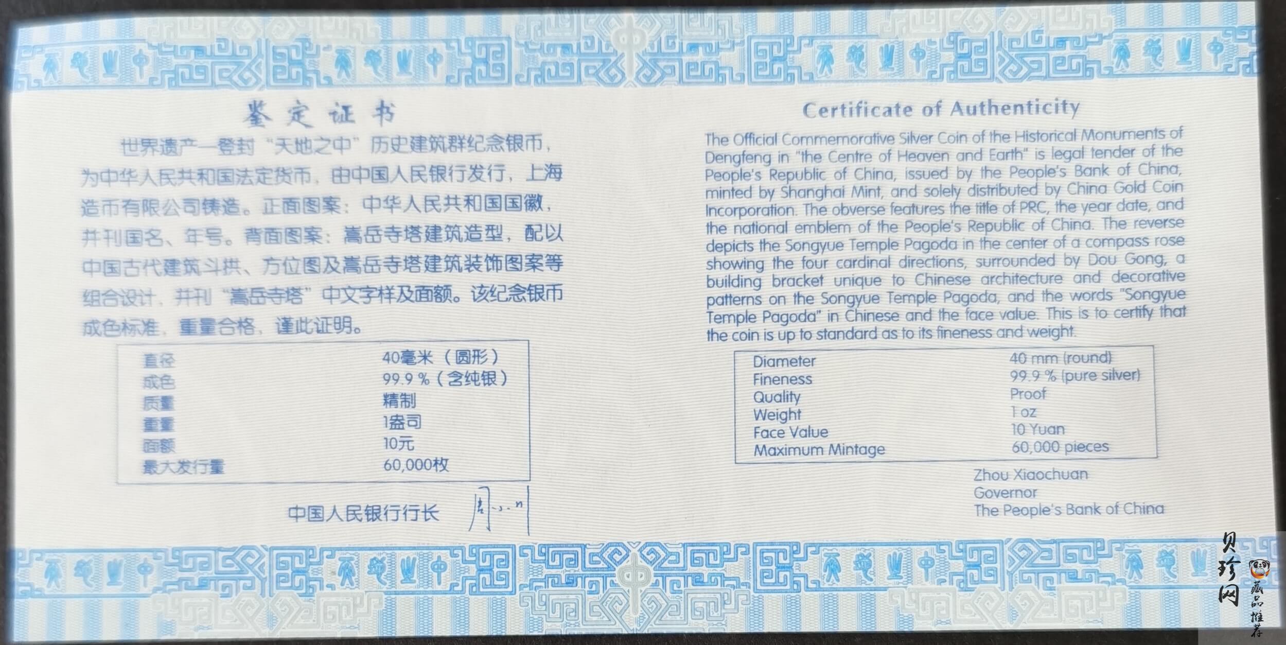 【110905】2011年世界遗产-登封嵩岳寺塔1盎司精制银币