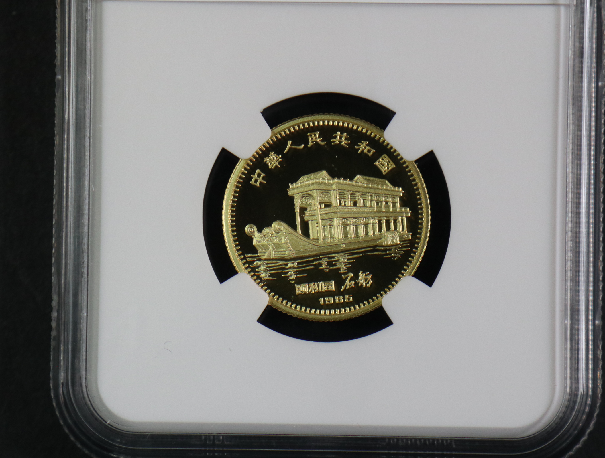 1985年发行的“乙丑(牛)年”8克金币,正面建筑图案是北京颐和园的石舫,位于万寿山西麓之昆明湖滨。全舫精巧华丽,上下浑然一体,是为观赏颐和园湖光山色之重要处所。