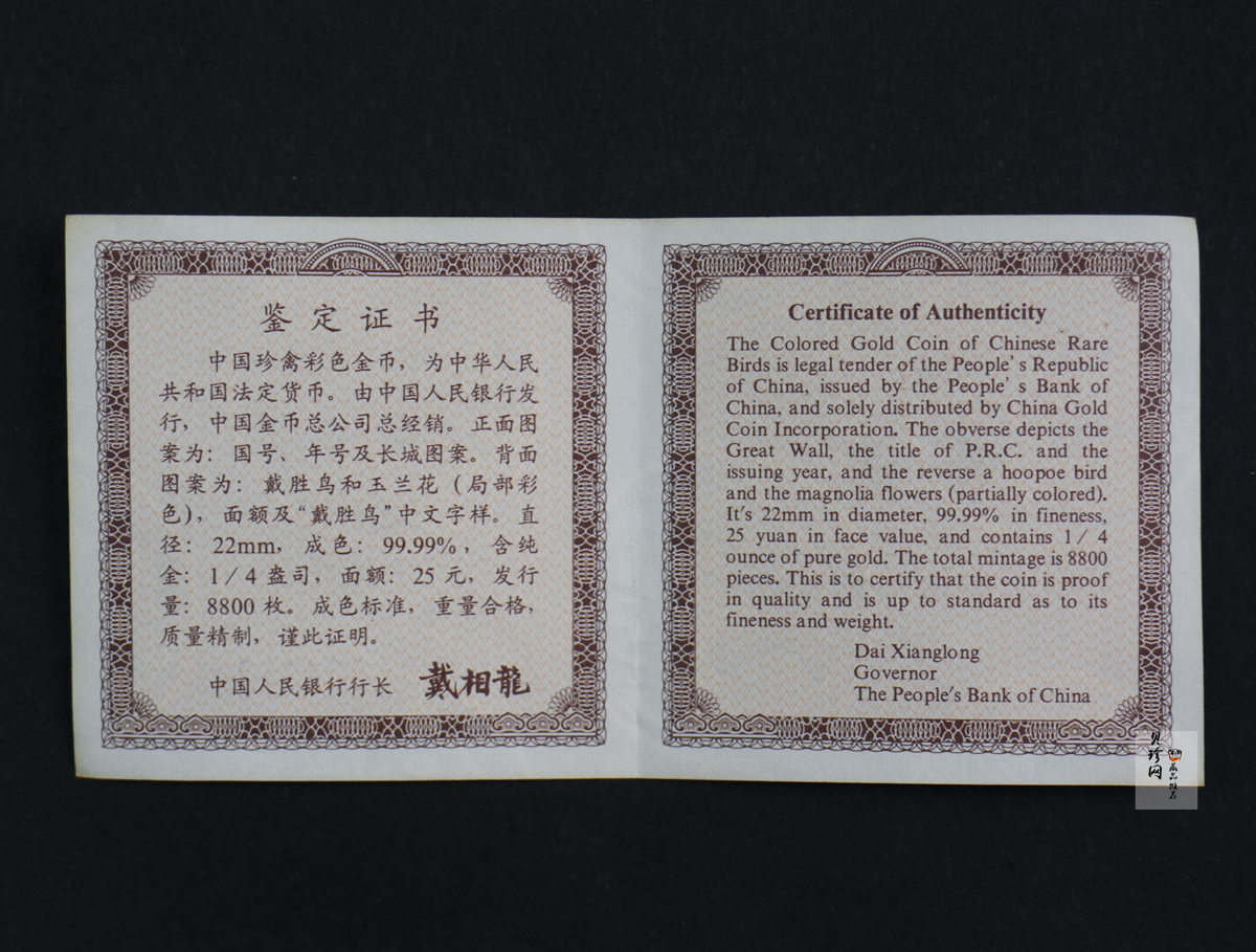 【000401】2000年中国珍禽系列(戴胜鸟)彩色金银纪念币1/4盎司彩色精制金币