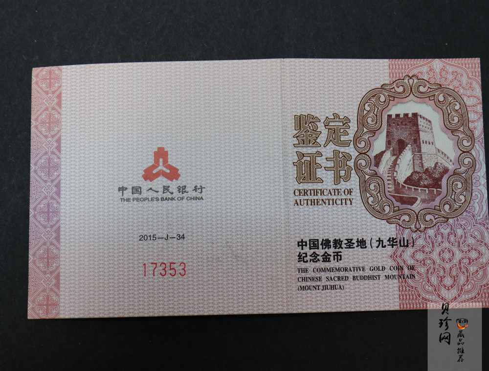 【150503】2015中国佛教圣地(九华山)1/4盎司精制金币