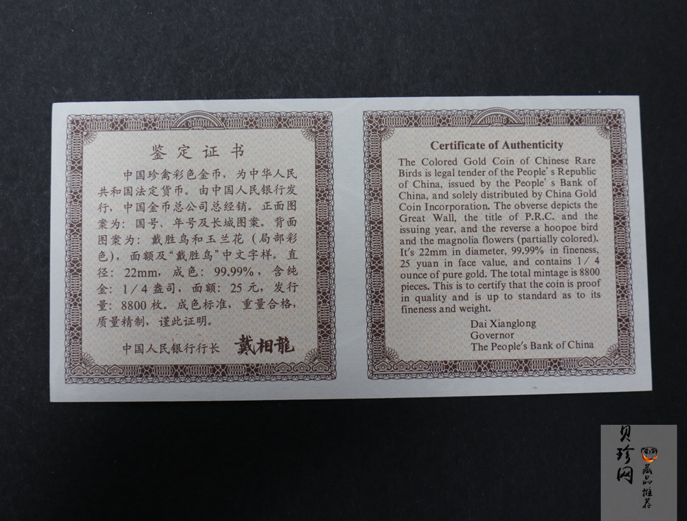 【000401】2000年中国珍禽系列(戴胜鸟)彩色金银纪念币1/4盎司彩色精制金币