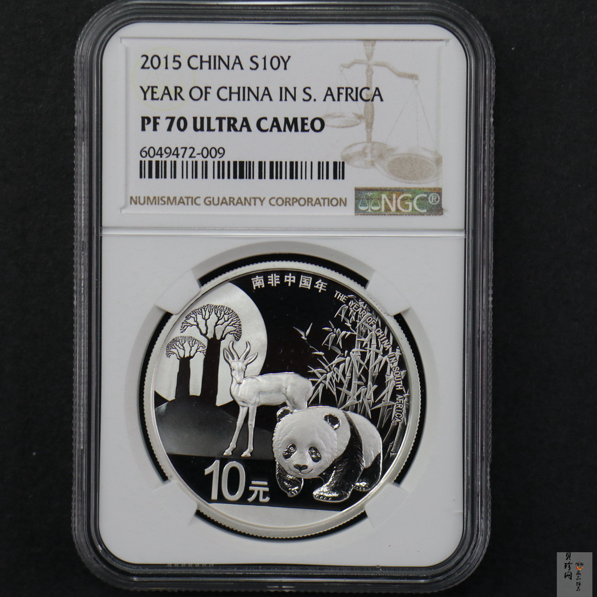 31.104克(1盎司)银币背面图案通过写实和寓意相结合,主景以两国代表性、典型性野生动物南非国兽跳羚与中国国宝大熊猫组合设计,背景衬猴面包树、月亮、竹子等元素造型,标“南非中国年”中、英文字样。南非国兽跳羚与中国国宝大熊猫分别为南非福格林金币、中国熊猫金银币背面图案的代表性元素,将这二者进行组合设计,是两国金银币最重要元素的一次组合,表现出平等与信任的主题。背面采用镜面底面,跳羚和大熊猫采用喷砂效果和反喷砂效果,背景猴面包树采用做亮效果,月亮、竹子等元素造型采用喷砂工艺。整个币面突出空间之广阔,近景、远景处理的十分恰当,设计元素个体清晰,设计、工艺均属上乘。