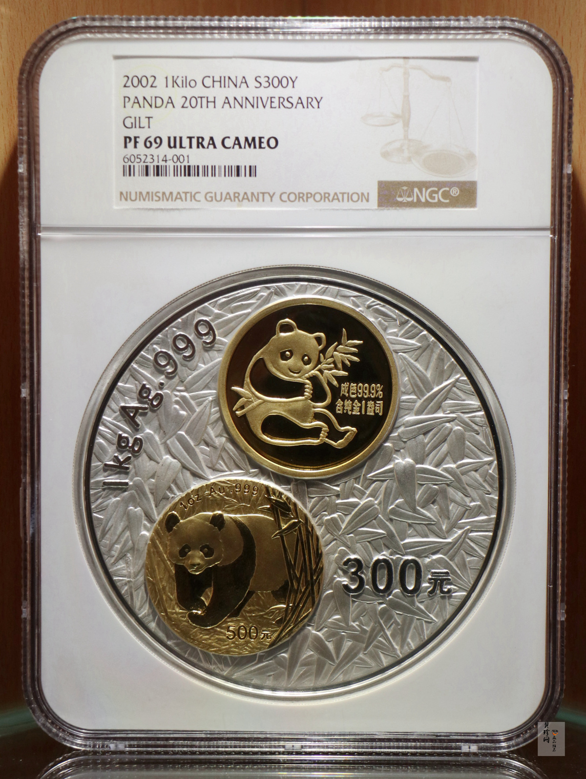 【020201】2002年中国熊猫金币发行20周年银铂纪念币1公斤镶金银币