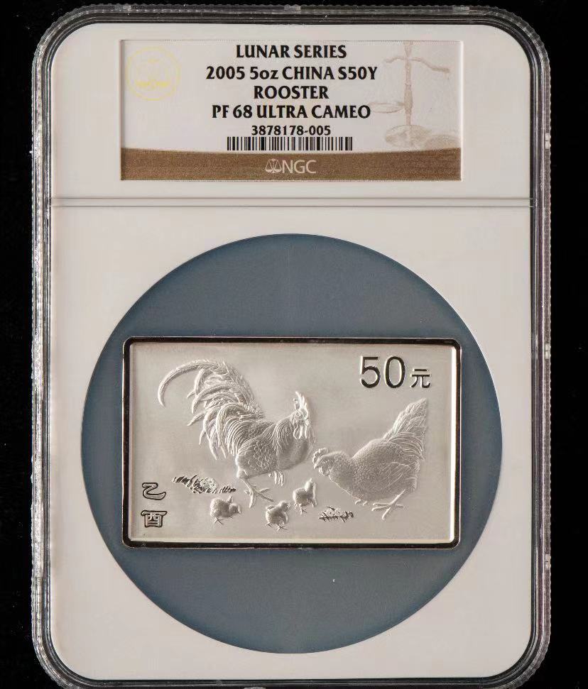 单币:2005年乙酉鸡年生肖5盎司长方形精制银币