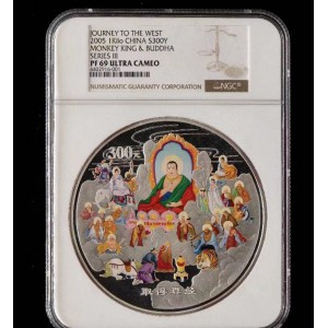 “取得真经”为1公斤超大规格银币。在张磊与宋鉴看来,贵金属大规格的尺幅,构图显出佛家意境的波澜壮阔,妙高山的其乐无穷。而圆形形则意在表达佛教教义的圆润通润。这也是币面表述的核心思路:灵柩高峰,佛教之圣境,半天中现祥光五色,瑞蔼千重;如来高升莲座,居中正襟危坐,宝相庄严的刻画,一双慈眉善目威而不露。