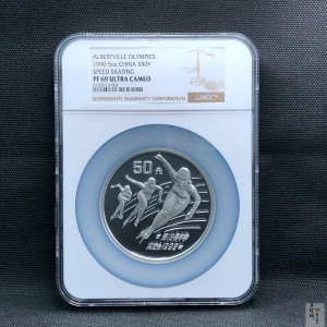 • 【900401】1990年第16届冬奥会金银纪念币-速度滑冰5盎司精制银币