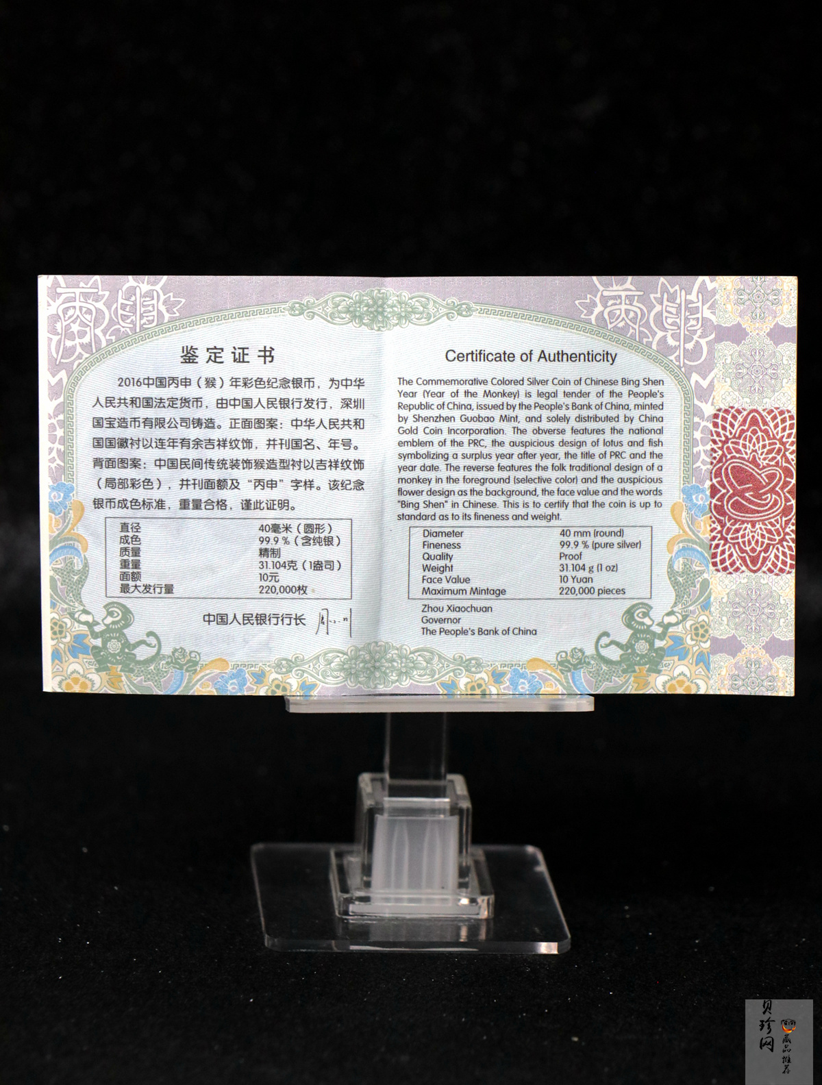 单币:2016年丙申猴年生肖1盎司彩色精制银币