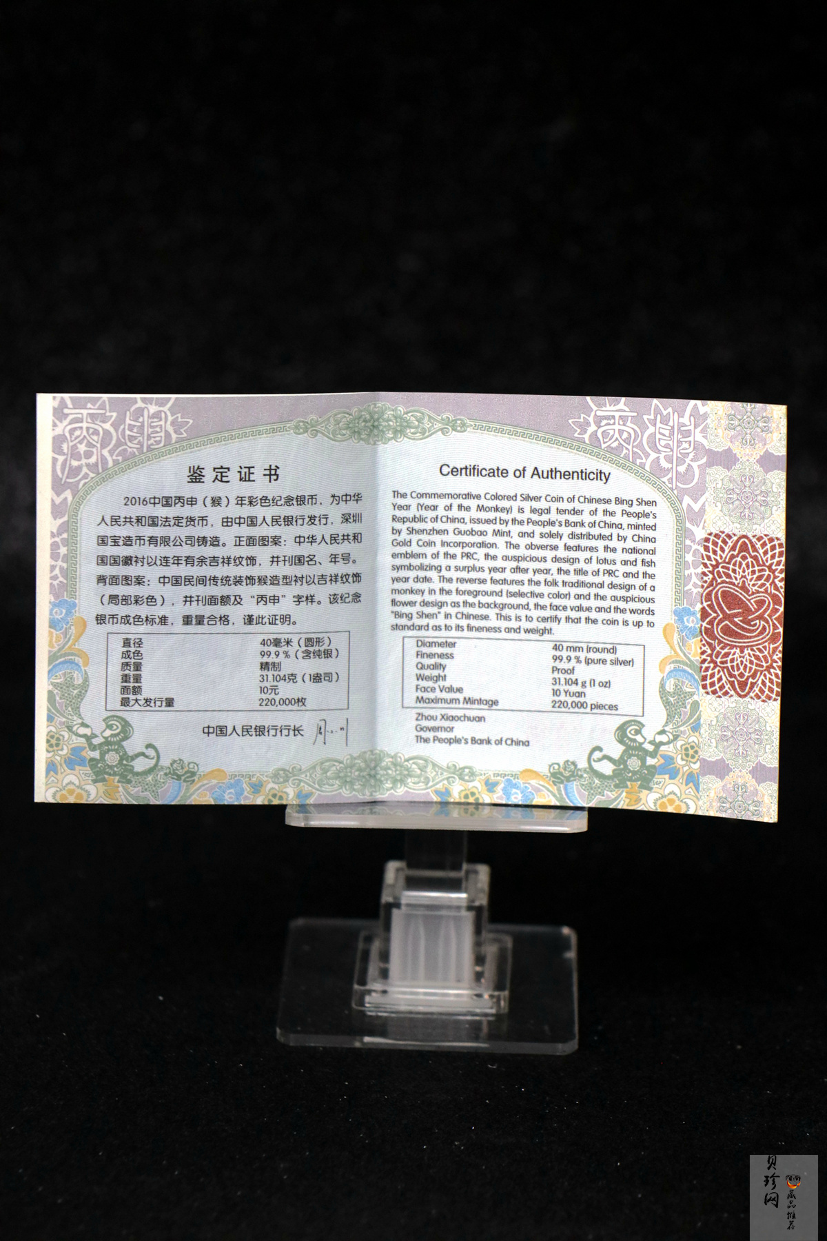 单币:2016年丙申猴年生肖1盎司彩色精制银币