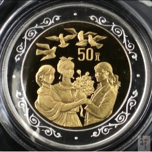 它的构图过于注释化,平铺直叙,仅仅只是币面主题的图片说明。币面的两个区域,上是4只在天空飞翔的和平鸽,下是分别代表欧洲、亚洲、非洲的3位女性形象。其中欧洲女性手持鲜花,其寓意与和平鸽相同,都是强调联合国第4次世界妇女大会团结、友好的整体氛围。“10元”面额于两个区域之间,带有隔断的色彩。这种构图可以用“完美无缺”来形容,但如果深层次探讨特色与个性,就有一定难度了。