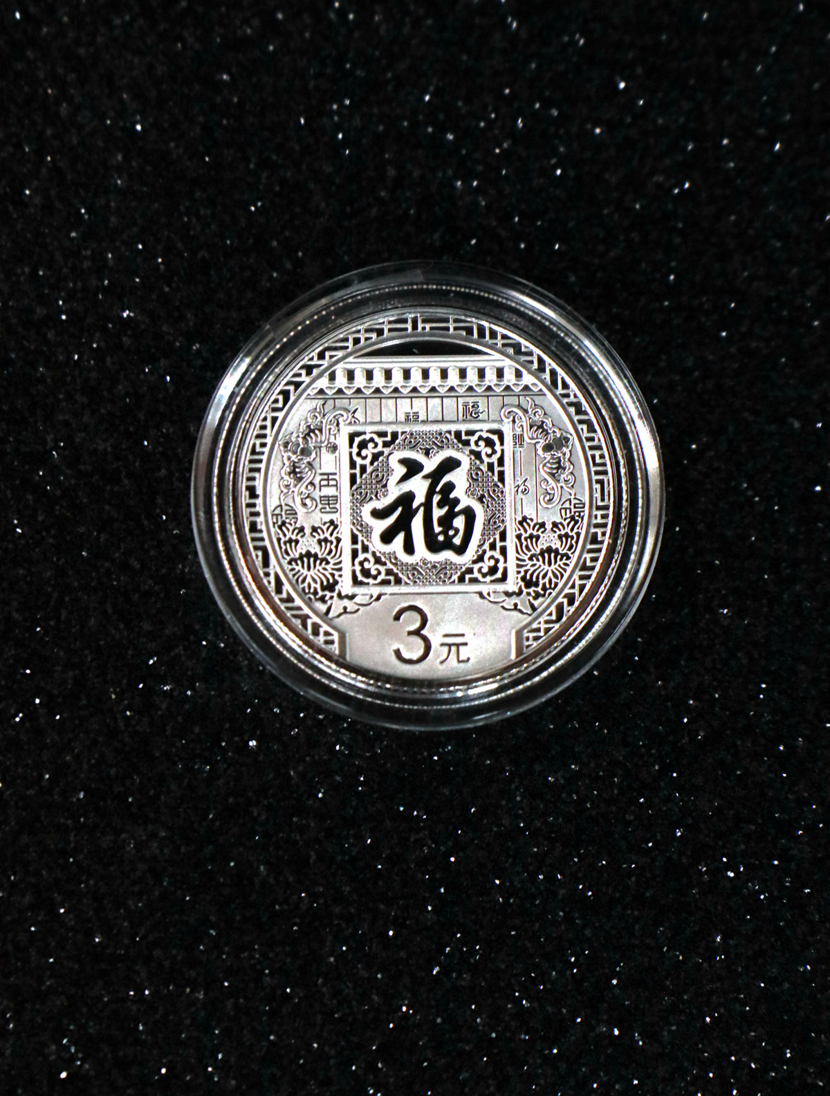 正面为中华人民共和国国徽,并刊国名、年号。背面为“福”字造型,配以月亮门、蝙蝠、牡丹花等装饰图案组合设计,并刊面额。梁元帝《春日》诗说:“处处春芳动,日日春禽新变”。在月亮门的旁边种着那“自李唐来世人盛爱”的牡丹,鲜艳迷人的牡丹种植于月亮门周围,表达出设计者希望象征富贵的牡丹花能够带来新一年好运的美好愿望。在月亮门的左右上方,装饰着蝙蝠图案,两只蝙蝠张开翅膀试图飞过月亮门。蝙蝠是中国传统文化中象征长寿的动物,一直被视为拥有五福临门的祥气,是吉祥和幸福的象征。当成群结队的蝙蝠越过粉墙黛瓦,进入充满温情的家庭中,抒写的正是福临门的福瑞征兆。纵观这枚8克贺岁纪念银币,它的设计图案左右对称,代表着和谐之意。月亮门、庭院、窗棂、砖瓦屋墙的设计,使我国传统建筑文化的精华凸显,凝固的艺术在银币之上闪烁着历史的光芒。