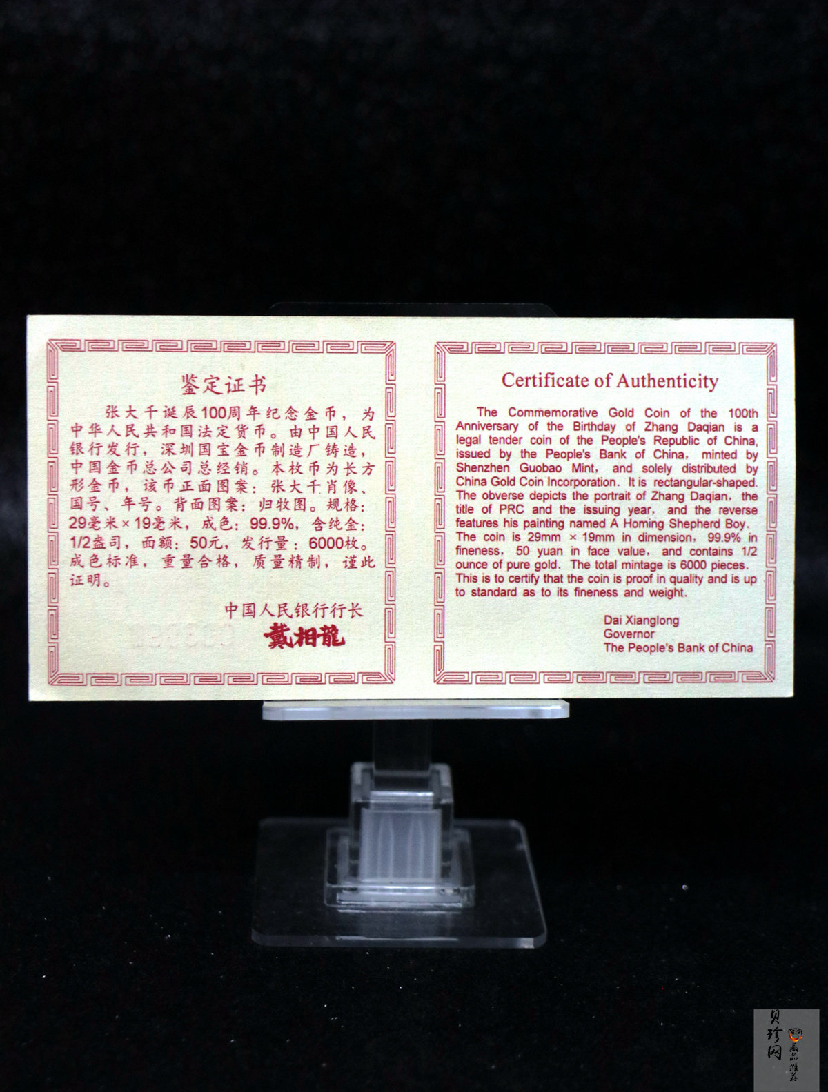 【990401】1999年中国近代国画大师张大千金银纪念币-归牧图1/2盎司长方形精制金币