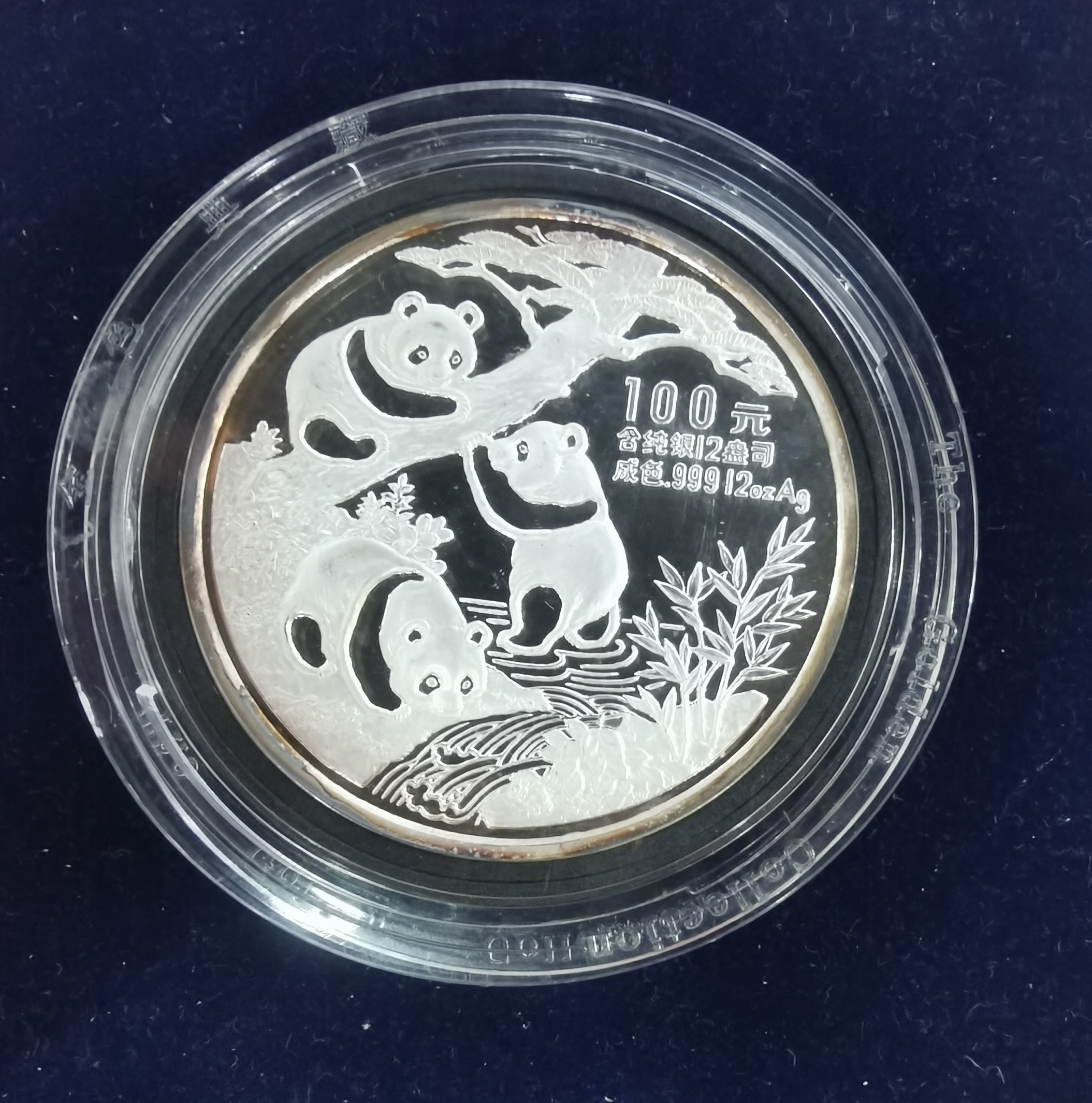 “熊猫”12盎司金币与银币背面图案的设计与雕刻着依旧为余敏。这也是继陈坚之后,另一个设计与雕刻“连中三元”。