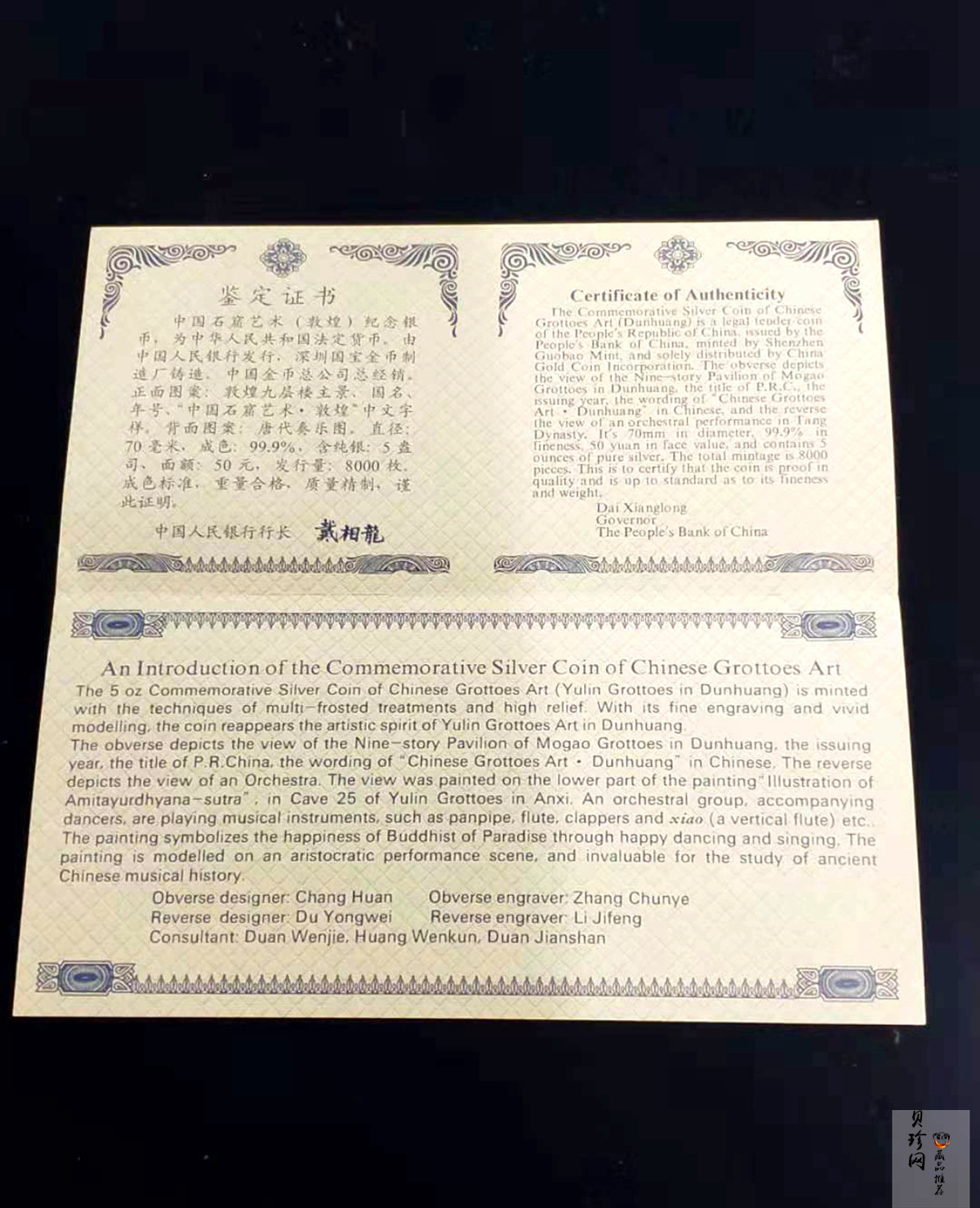 【010404】2001年中国石窟艺术(敦煌)金银纪念币-唐代奏乐图5盎司高浮雕精制银币