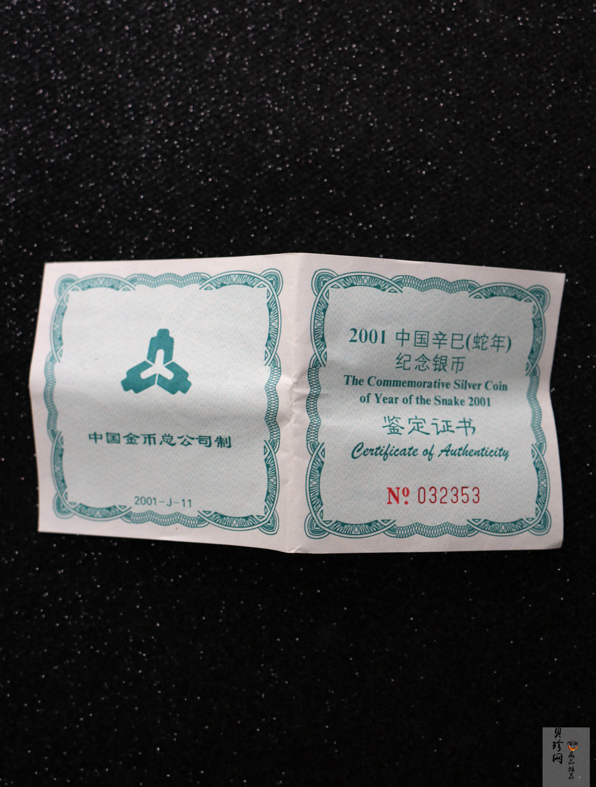• 【010210】2001中国辛巳(蛇)年金银纪念币-盘蛇图1盎司普制银币
