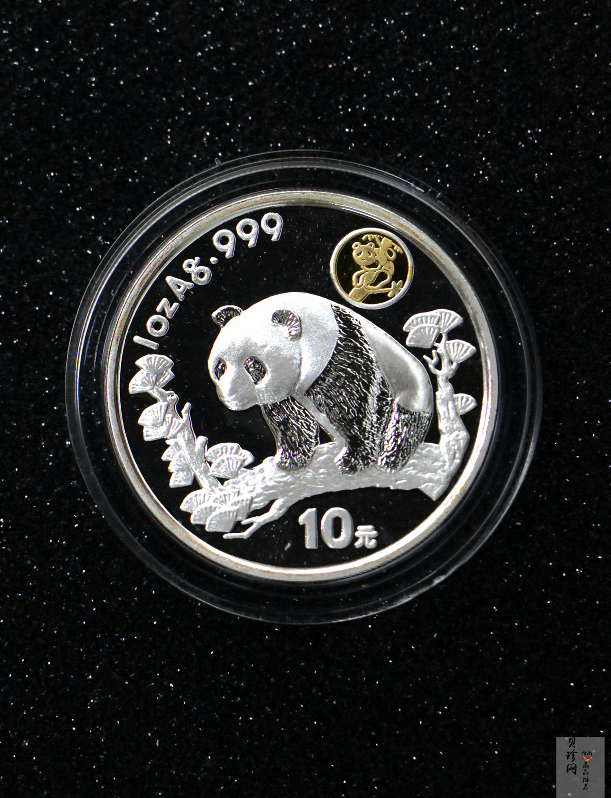 中国人民银行发行“1997上海国际邮票钱币博览会”纪念银币,依旧为“熊猫”加字,母本为1997版“熊猫”1盎司普制银币,制作延续“1996北京国际钱币博览会”设计与加工,继续采用了镶嵌工艺。其式样,同样为“银镶金加字熊猫币”。