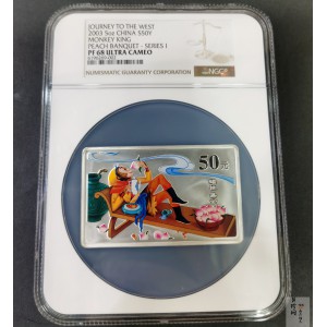张江以贵金属语言表现,更有独特之处:蛇形状的一抹云烟自左至右横贯天际,曲线如波优美柔和,逶迤延展富于变化和动感;目光所及处香雾霭霭祥云满空,风和日丽光彩熙熙,意味着齐天大圣横躺竖卧的所在乃是天庭。他全然不顾瑶池的清规戒律,左手持桃,右手擎酒,神态闲逸的身姿和醉意朦胧的面容上哪里看得出半点的惧意。具体落笔,设计中的工笔勾勒,印制中的重彩浓墨,方方面面都有顾及。最终塑造出来的“孙悟空”,有京剧脸谱和动画片的一些特点,也有民间年画的处理手法,形象活泼可爱,人物夸张有度又不失真。但见他:戴一顶赭黄色软巾幞头,被一领绛綃披肩,虎皮裙腹间扎靠,蓝丝绶腰间婉转,黑云履足下蹒跚。背后青铜罍盛满琼浆玉液,看似酒醉却癫而不狂。