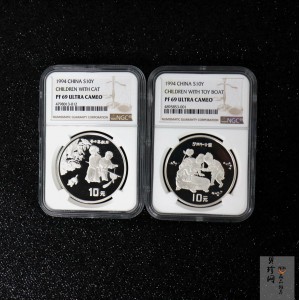 套币:1994年中国古代名画婴戏图-冬日戏猫图、子孙和合图纪念银币两枚一套