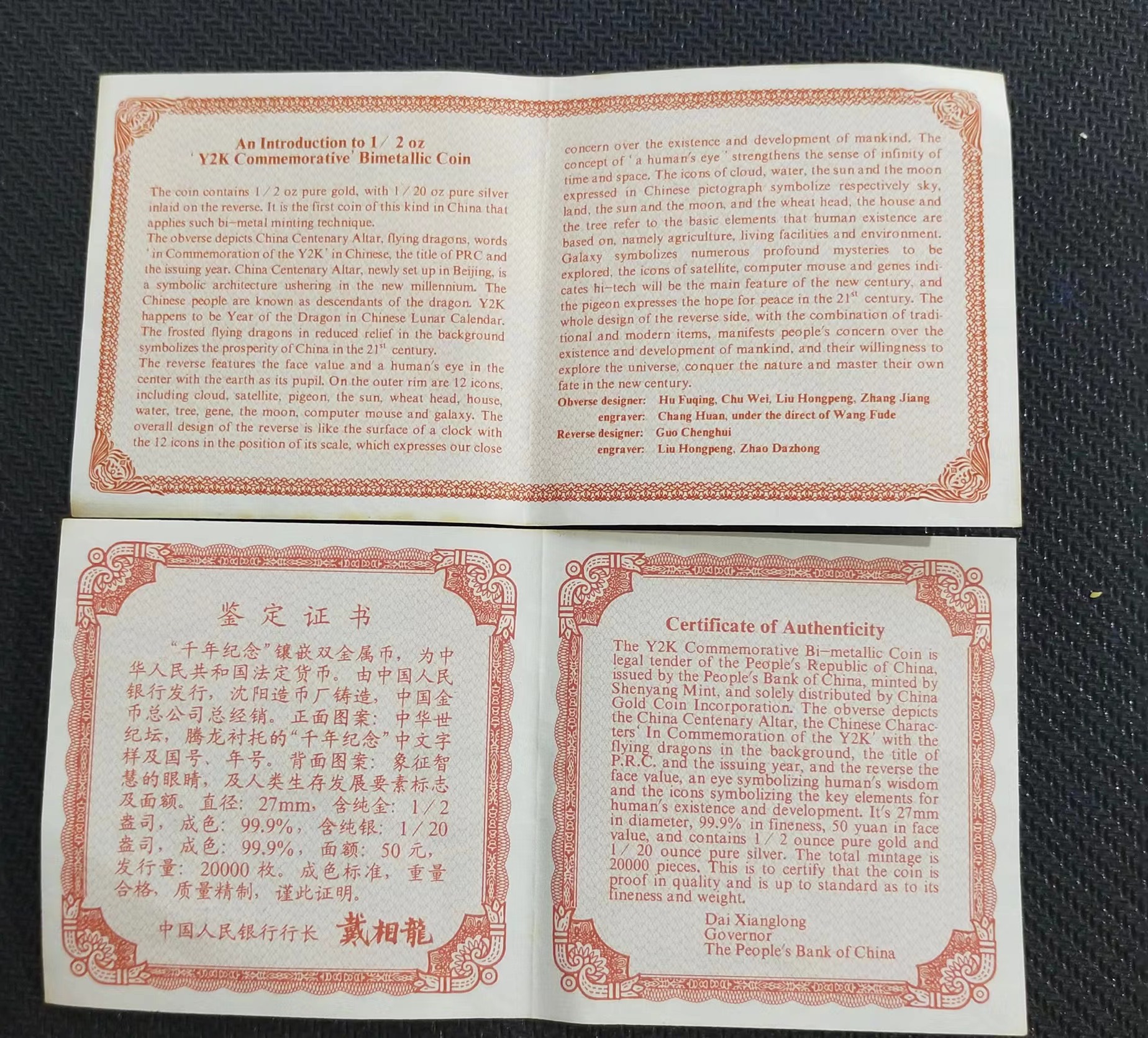 中国造币领域顶级的设计大师,独到的立意构图和几十年积累的雕刻功夫,会展示在这个画面的雕刻上,尤其是贵金属雕刻技法的复杂多变,将龙身体肌理纹路上的繁复刻画得如幻如真,构图新颖奇特,寓意古老的中华民族千年之际以崭新的姿态屹立于世界之巅,既有雕刻般的体积和厚重感,又有一种气息流动的空灵感。它将不仅是中华民族的象征,它还将代表中华民族的精神,成为新世纪的中华魂。