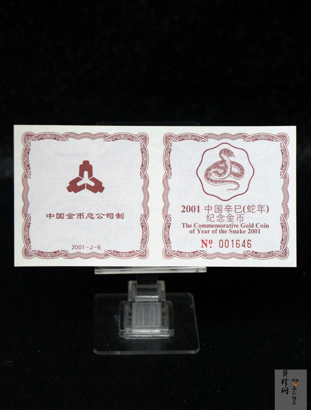 • 【010203】2001中国辛巳(蛇)年金银纪念币-盘蛇图1/2盎司梅花精制金币