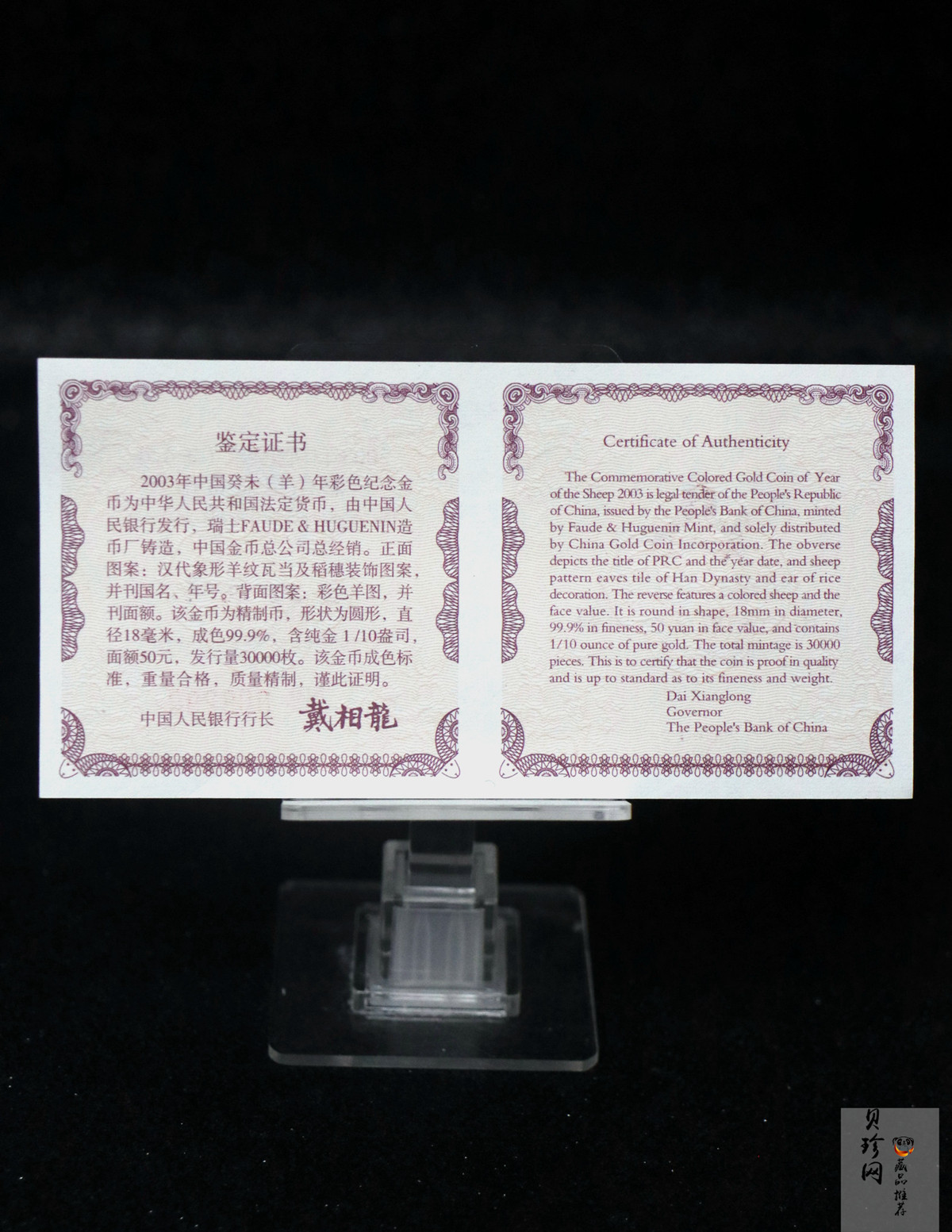 【030205】2003中国癸未(羊)年金纪念币1/10盎司彩色精制金币