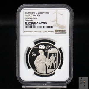 落笔非常从容。币面主体是一位老中医的半身大特写。坊间认为,中医大夫的医术,通常与年龄相关,年龄越大,经手的疑难杂症越多,治疗的经验丰富,自然医术也就越高明。出于这个理念,宴井奎塑造老中医形象时,特别通过他长约半尺的胡须以及脸上浮现的岁月沧桑,以突出他满腹经纶。但此时的老中医并不是治病,而是在授学。他一手持银针,一手指人体图,在向学生讲解针与灸的要领。或许过于投入,或许过于陶醉,或许对人体穴位早烂熟于心,老中医一双眼睛紧闭,坦然而自信。