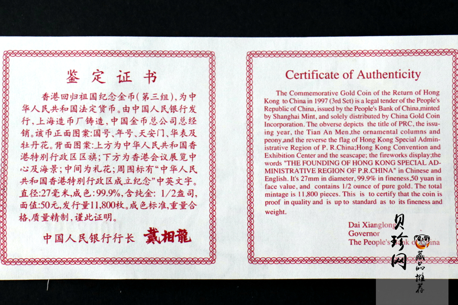 【970902】1997年香港回归祖国金银纪念币(第3组)-香港1/2盎司精制金币