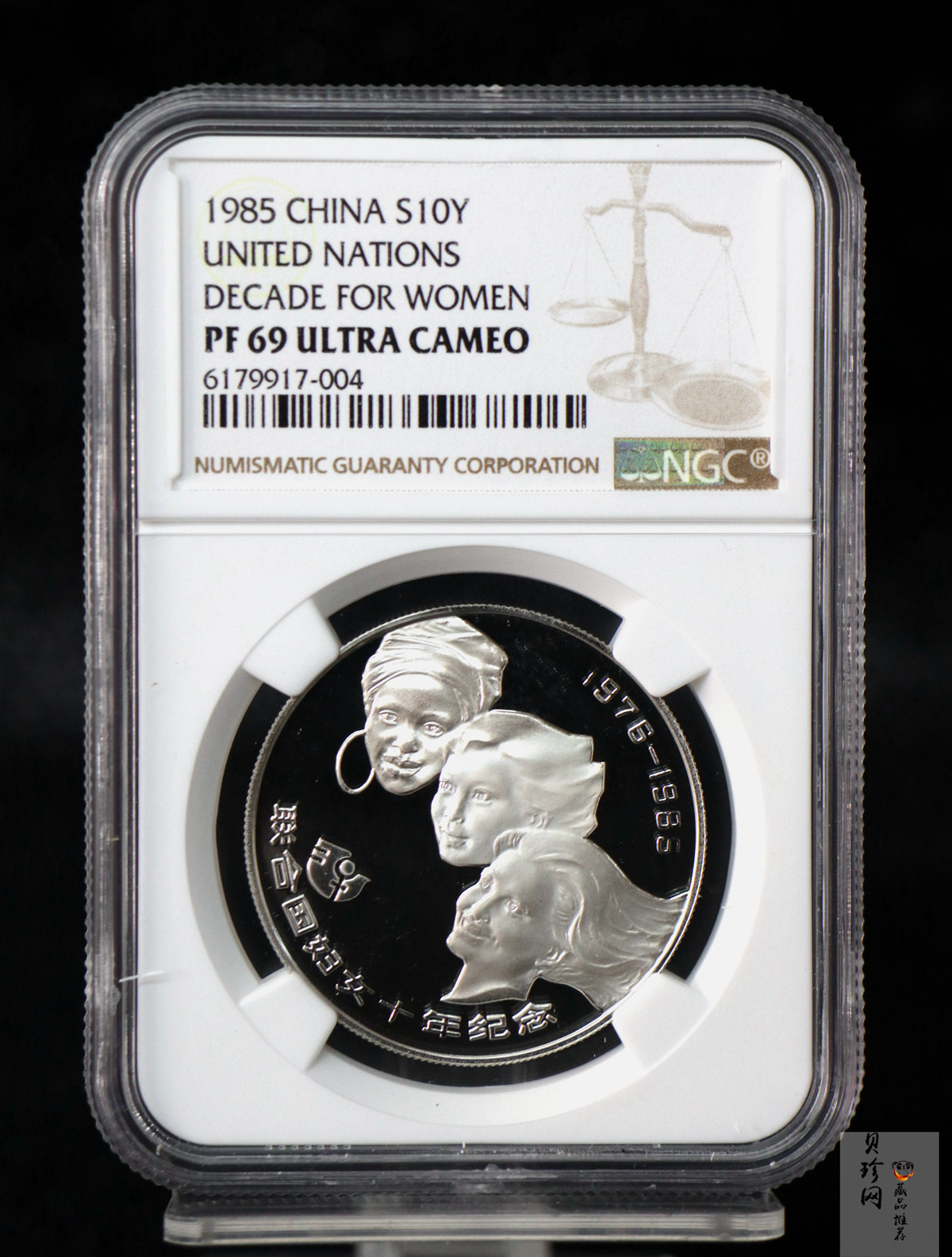 1985年是联合国妇女大会十年的特殊日子,为纪念这一历史时期,中国人民银行于该年发行联合国妇女10年纪念银币一枚。联合国妇女10年纪念银币正面图案为国徽图案、两边饰有两只左右对称的凤凰纹样,并刊国名、面额;联合国妇女10年纪念银币背面图案为黄、黑、白三色人种的女性头像,头像右上方刊有“1976-1985”年号,主图下方刊有“联合国妇女十年纪念”字样,字样上方是和平鸽的会徽。联合国妇女10年纪念银币为精制币,含纯银1/2盎司,直径36毫米,面额10元,成色92.5%,发行量为4000枚,由上海造币厂铸造。主题形象是三位不同种族但同样美丽淳朴的妇女,她们脸上绽放出灿烂的笑容,彷佛这一幸福时刻永远的被定格在联合国妇女10年纪念银币上。简单的构图、精美细致的雕刻、但极富深刻的内涵。她们虽然来自不同国家,不同民族,有着不同的肤色和价值观,但是她们的心是相通的,连在一起的,我们希望生活在地球上任意角落里的人们都应该尊重每一位妇女,妇女也拥有被平等待遇的权利,无论语言、肤色、信仰不同,但这都不是阻碍妇女获得拥有自由、平等与公正的权利障碍。