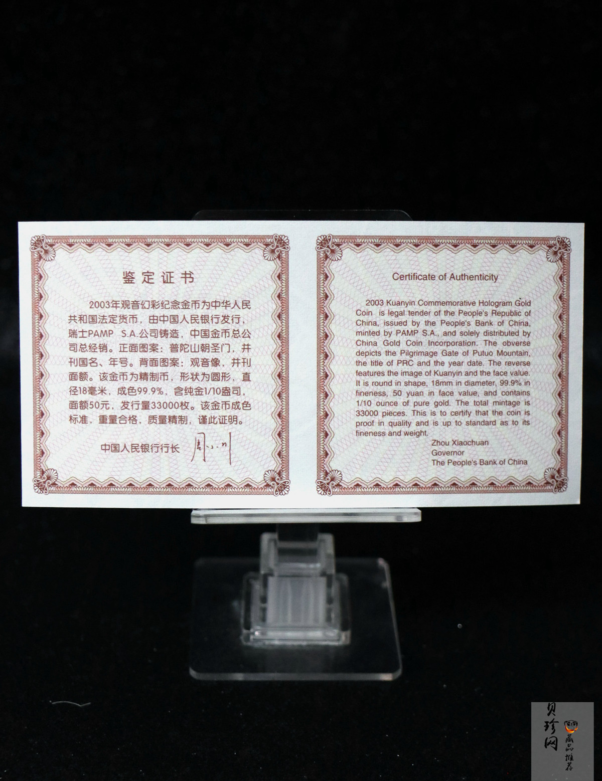 • 【031001】2003年观音纪念币-观音像1/10盎司圆形幻彩精制金币