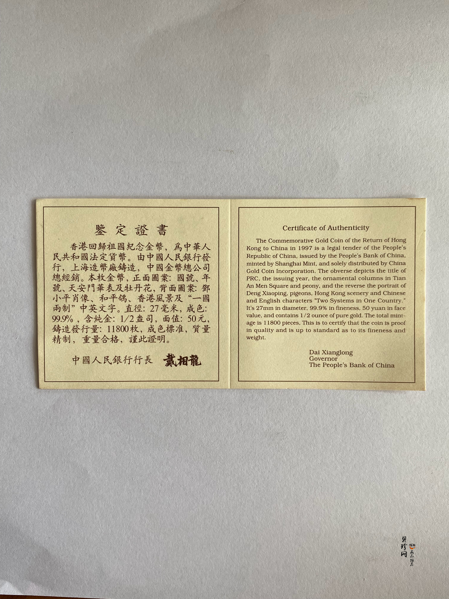 单币:1995年香港回归祖国(第1组)1/2盎司精制金币