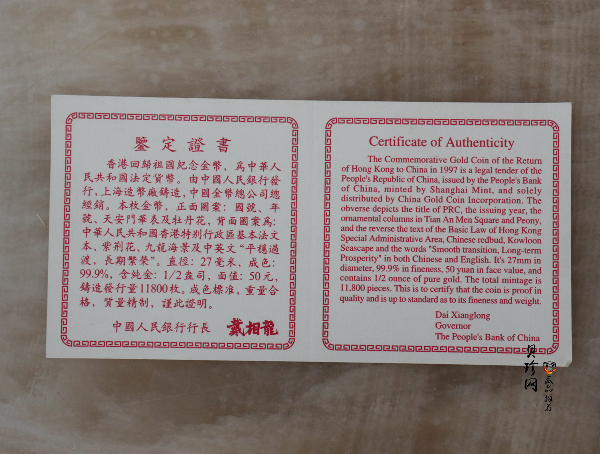 【961202】1996年香港回归祖国金纪念币(第2组)1/2盎司精制金币