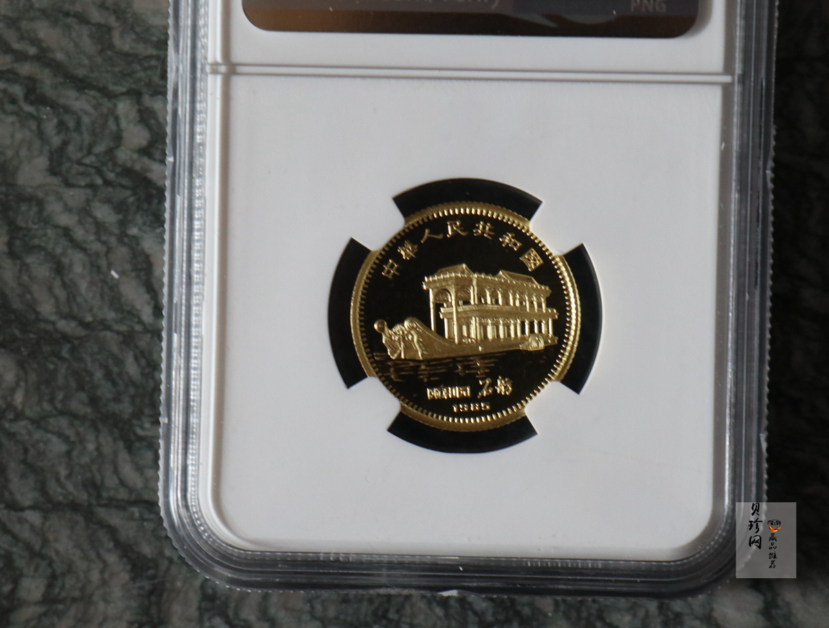 1985年发行的“乙丑(牛)年”8克金币,正面建筑图案是北京颐和园的石舫,位于万寿山西麓之昆明湖滨。全舫精巧华丽,上下浑然一体,是为观赏颐和园湖光山色之重要处所。