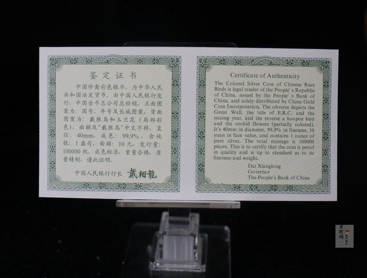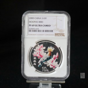 单币:2000年中国珍禽系列(戴胜鸟)彩色金银纪念币1盎司彩色精制银币