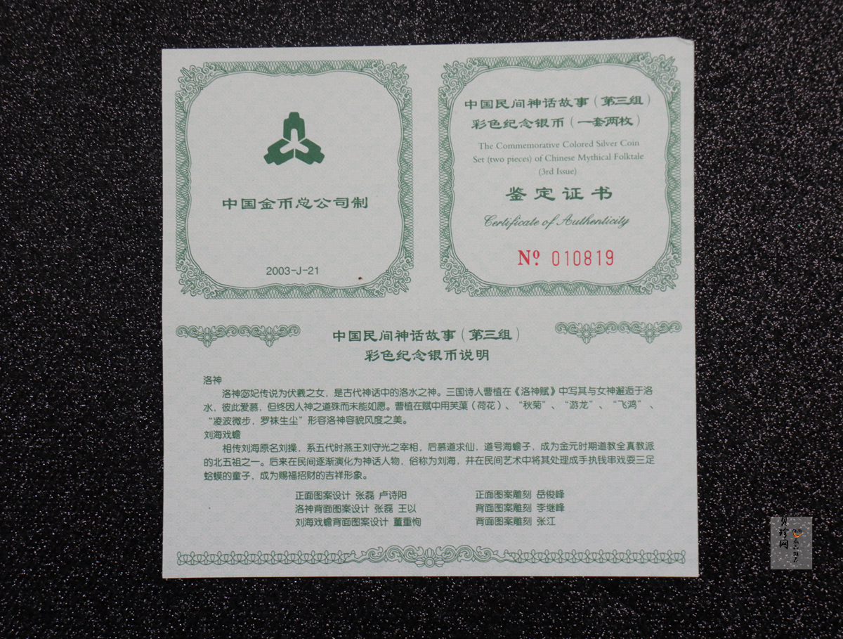 套币:2003年中国民间神话故事(第3组)1盎司彩色精制银币2枚一套