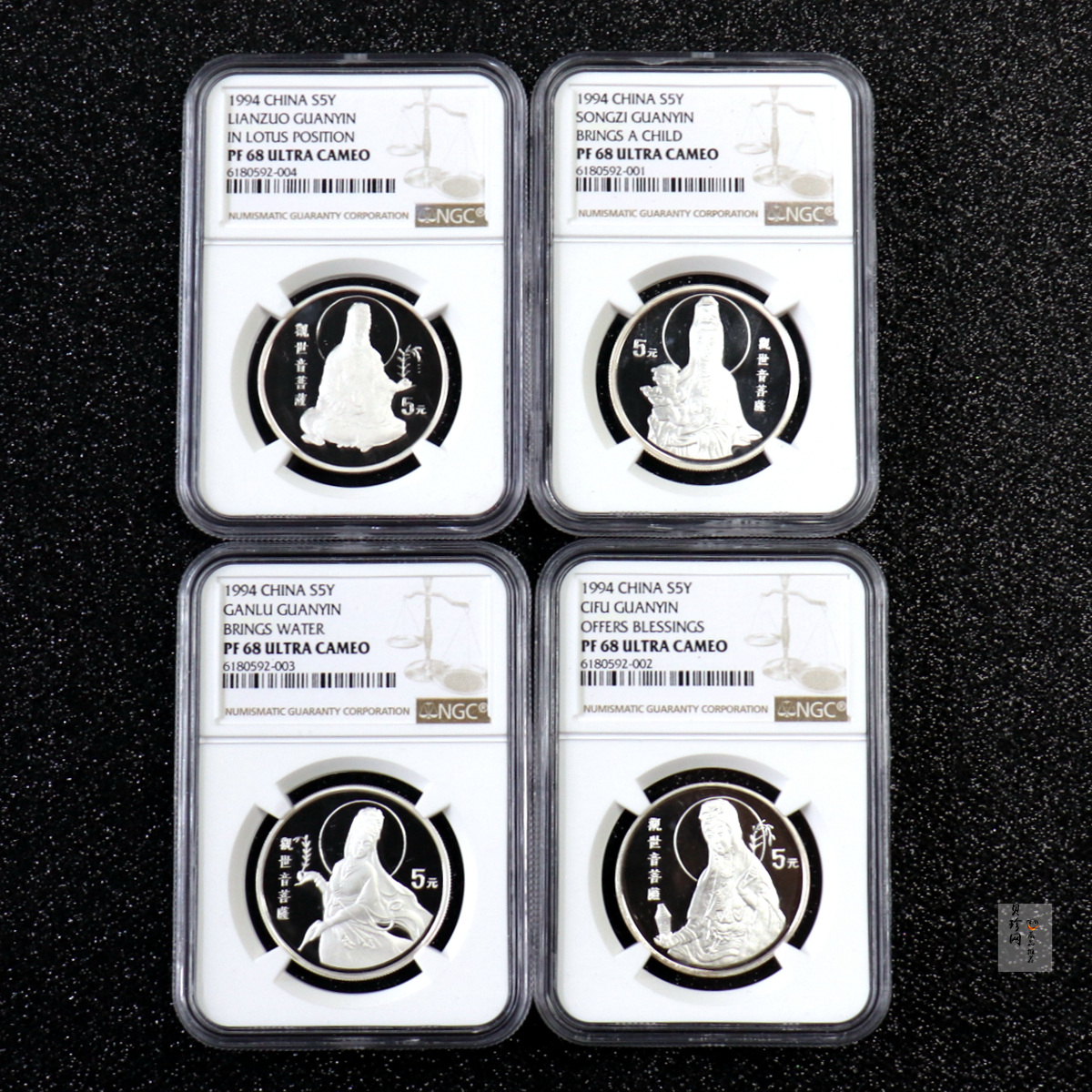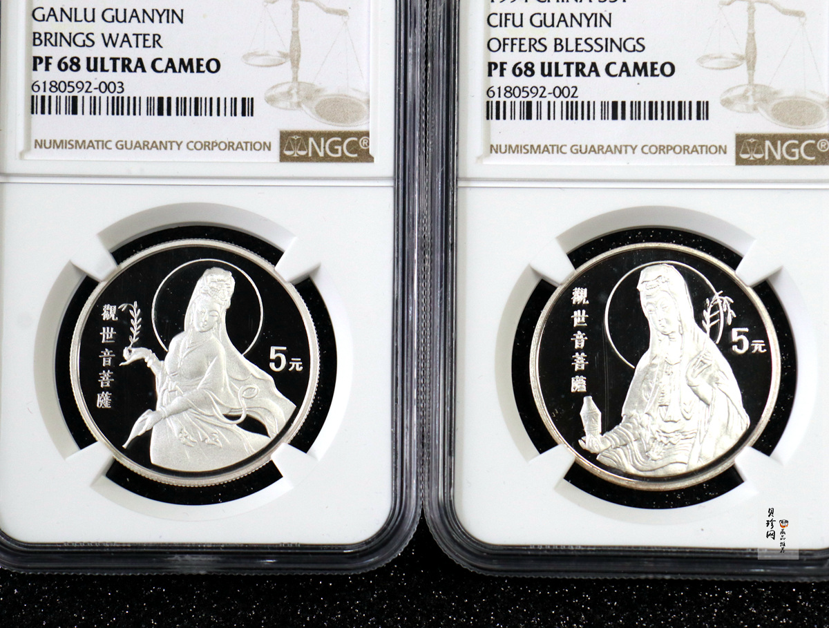 送子观音:慈眉善目,充满世俗人格化色彩是1994年“送子观音”金银币最突出的神韵。“千处祈求千处应”是观音信仰的核心,作为民间创造出来的“送子观音”,是民间伦理“多子多福”的印照,愿大慈大悲观音菩萨保佑,赐予信徒子孙满堂,香火旺盛,家族锦延。