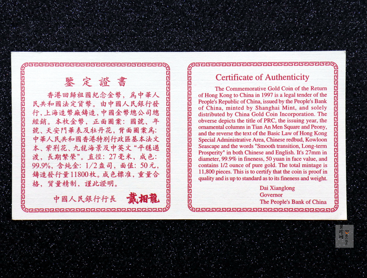 【961202】1996年香港回归祖国金纪念币(第2组)1/2盎司精制金币