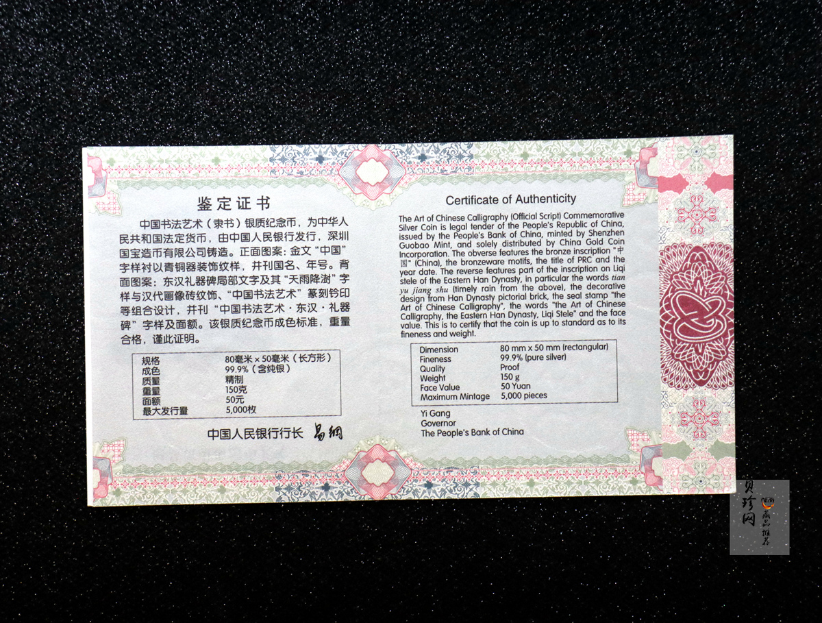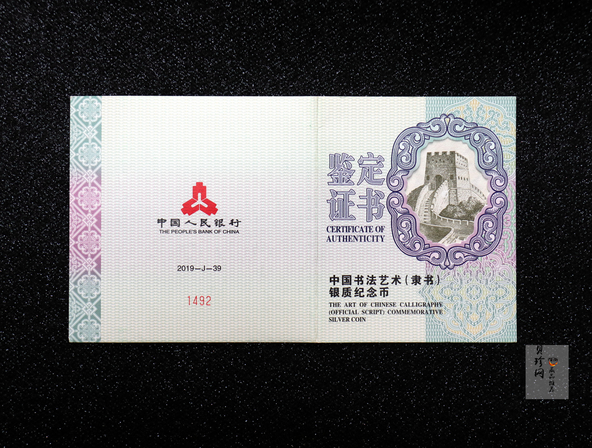 • 【190802】2019年中国书法艺术(隶书)纪念币150克长方形银币