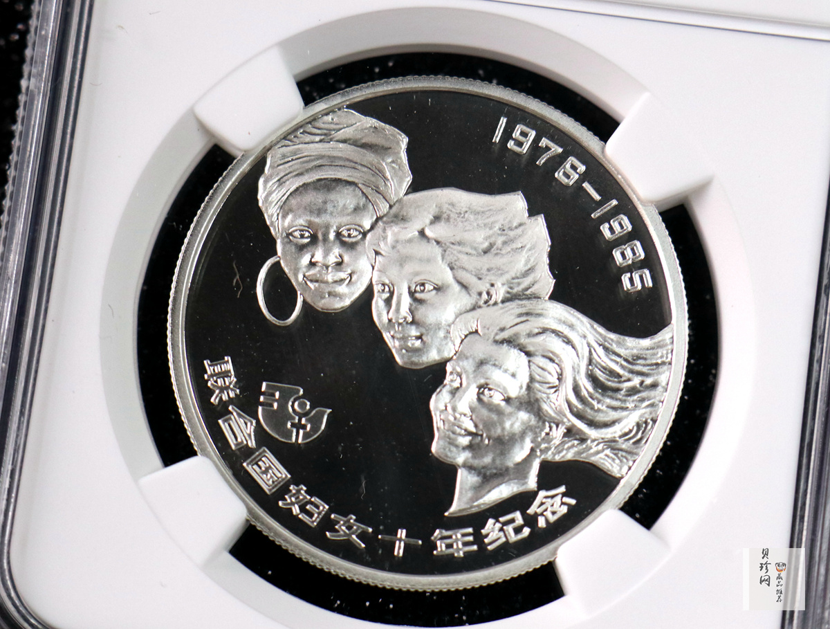 1985年是联合国妇女大会十年的特殊日子,为纪念这一历史时期,中国人民银行于该年发行联合国妇女10年纪念银币一枚。联合国妇女10年纪念银币正面图案为国徽图案、两边饰有两只左右对称的凤凰纹样,并刊国名、面额;联合国妇女10年纪念银币背面图案为黄、黑、白三色人种的女性头像,头像右上方刊有“1976-1985”年号,主图下方刊有“联合国妇女十年纪念”字样,字样上方是和平鸽的会徽。联合国妇女10年纪念银币为精制币,含纯银1/2盎司,直径36毫米,面额10元,成色92.5%,发行量为4000枚,由上海造币厂铸造。主题形象是三位不同种族但同样美丽淳朴的妇女,她们脸上绽放出灿烂的笑容,彷佛这一幸福时刻永远的被定格在联合国妇女10年纪念银币上。简单的构图、精美细致的雕刻、但极富深刻的内涵。她们虽然来自不同国家,不同民族,有着不同的肤色和价值观,但是她们的心是相通的,连在一起的,我们希望生活在地球上任意角落里的人们都应该尊重每一位妇女,妇女也拥有被平等待遇的权利,无论语言、肤色、信仰不同,但这都不是阻碍妇女获得拥有自由、平等与公正的权利障碍。