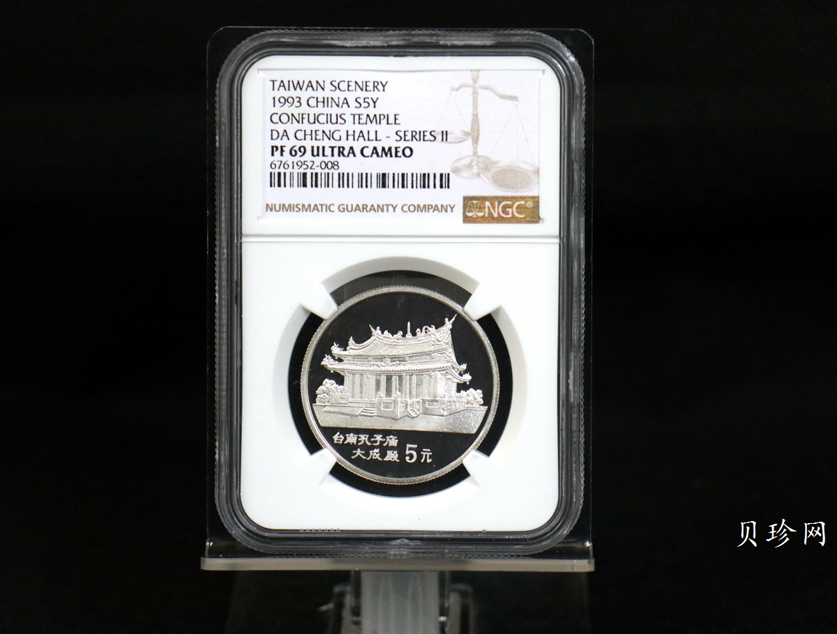 “台南孔子庙大成殿”构图异常精妙,它以三分之二的画面,将“大成殿”至于其中。视角略有25度倾斜,既不破坏主体壮观于完整,又多角度地展示了大成殿的内部构造。尤其值得称道的是,建筑上端的漂亮翘檐,在币面上呈现出一钩月牙的下弧,反过来,又衬映出下端建筑的庄严肃穆。最终形成的效果虽简单直白,但主题十分突出。而“大成殿”建筑本身,也以深厚与豪放博大为特色,因而表达之中更有一种酣畅。