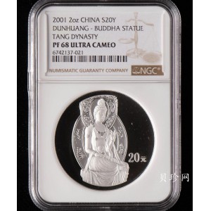 单币:2001中国石窟艺术(敦煌)金银纪念币-盛唐菩萨像2盎司高浮雕精制银币