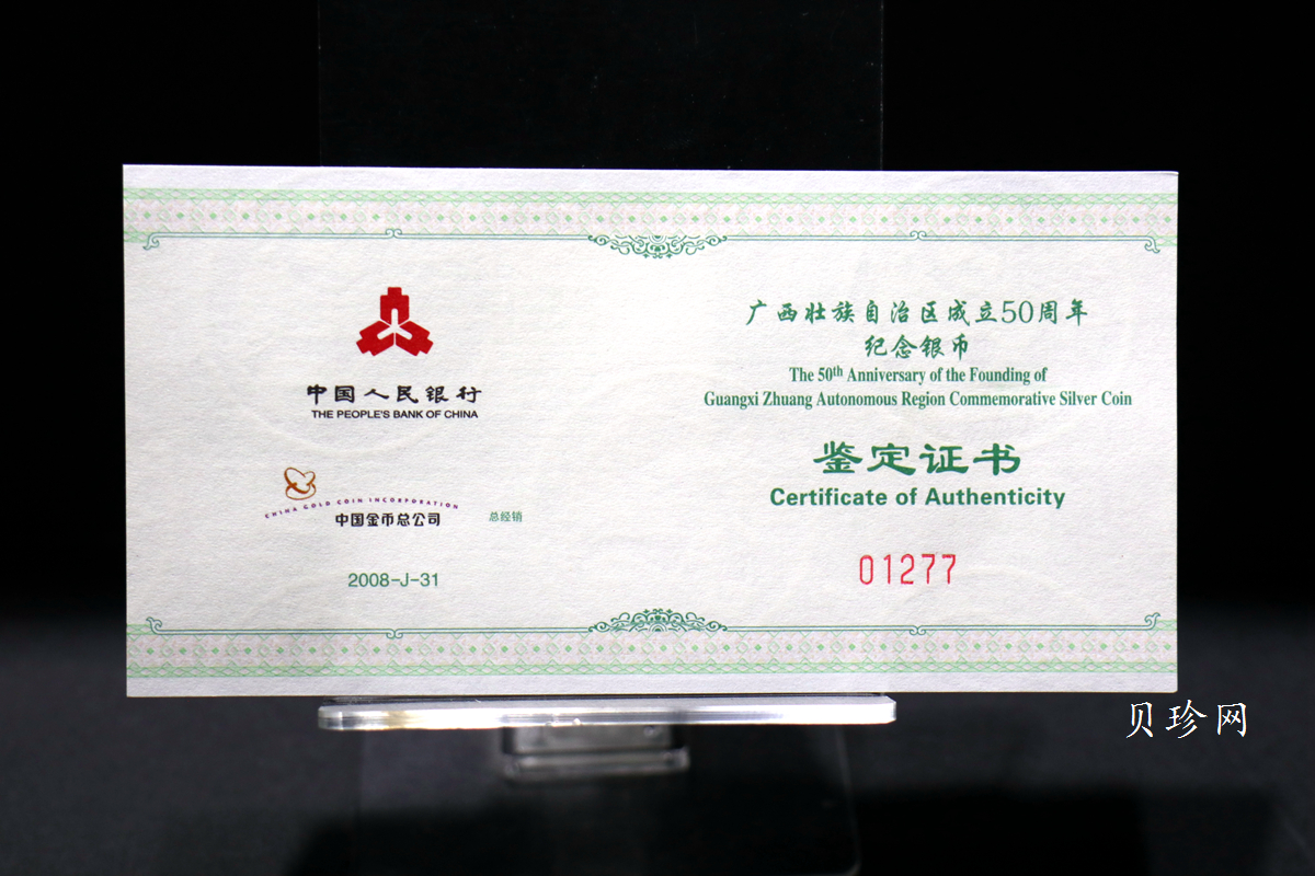 • 【080801】2008年广西壮族自治区成立50周年1盎司精制银币