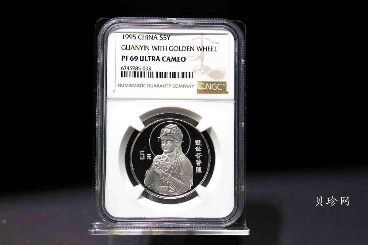 金轮观音:1995年“观音”金银纪念币背面图案的4幅图稿,均由美国天坛钱币公司刘建雄提供,清一色为善目低眉的半身法相。其中“莲花观音”图稿为正面直视,另外三款,包括郁友奎创作的“金轮观音”金银币在内,都带有一定斜度的左侧。虽大同,但小异,且各有“异”的特点与风格,再加上设计师不同的认知与不同的创作理念,最终表现出的“观音”,便有强烈的个性和不同风采。